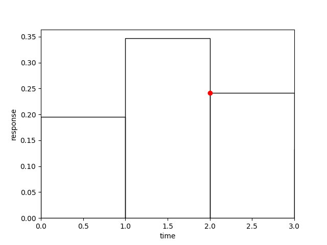 update_coefs()based on an integrable function. Usually, this function is anIUHsubclass instance, but (as in the following example) other function objects defining instantaneous unit hydrographs are acceptable, too. However, they should be well-behaved (e.g. be relatively smooth, unimodal, and strictly positive and have an integral surface of one in the positive range).For educational purposes, we apply some (problematic) discontinuous functions in the following. The first example is a simple rectangle impulse: